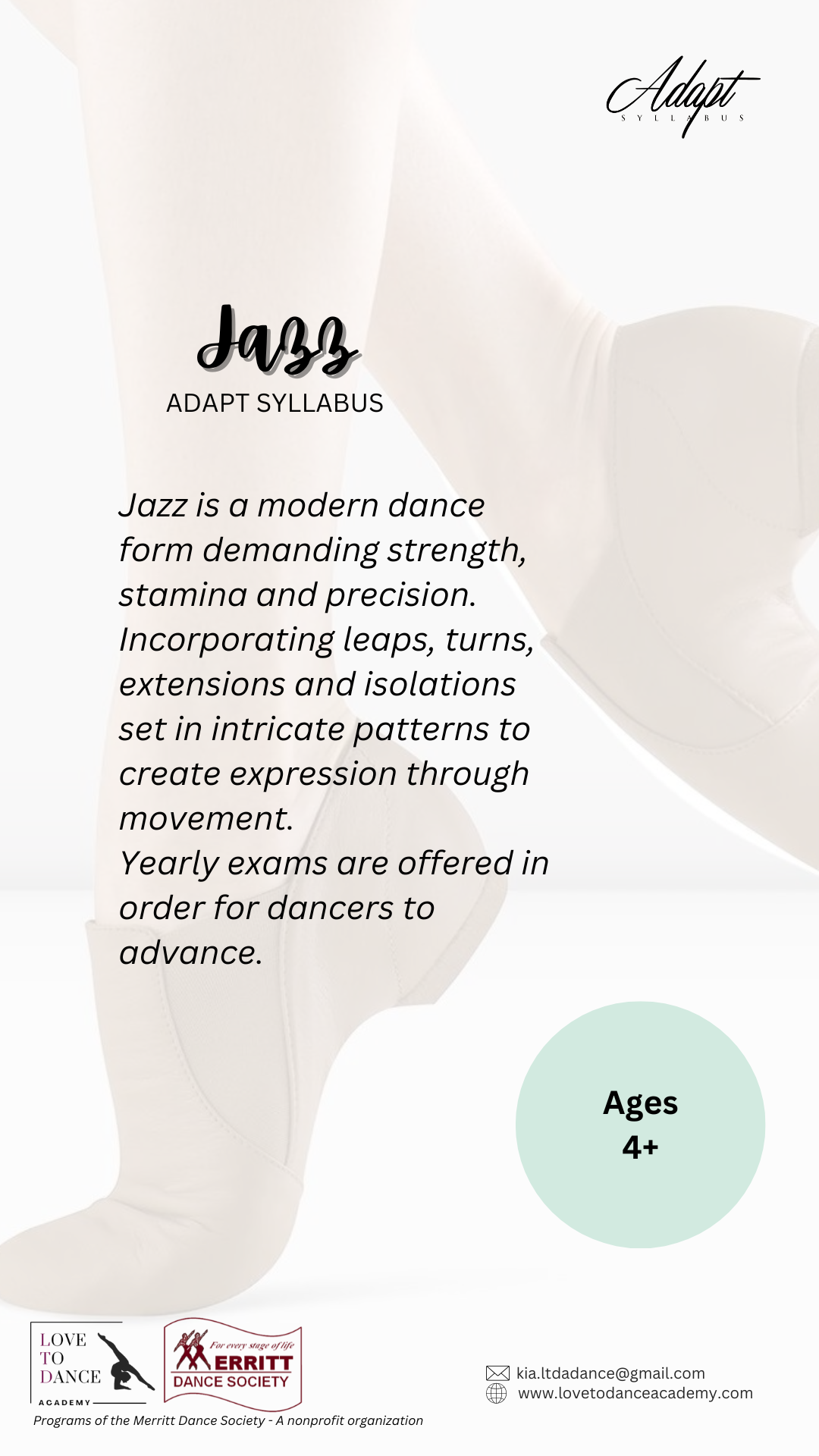 Jazz is a modern dance form demanding strength, stamina and precision. Incorporating leaps, turns, extensions and isolations set in intricate patterns to create expression through movement.