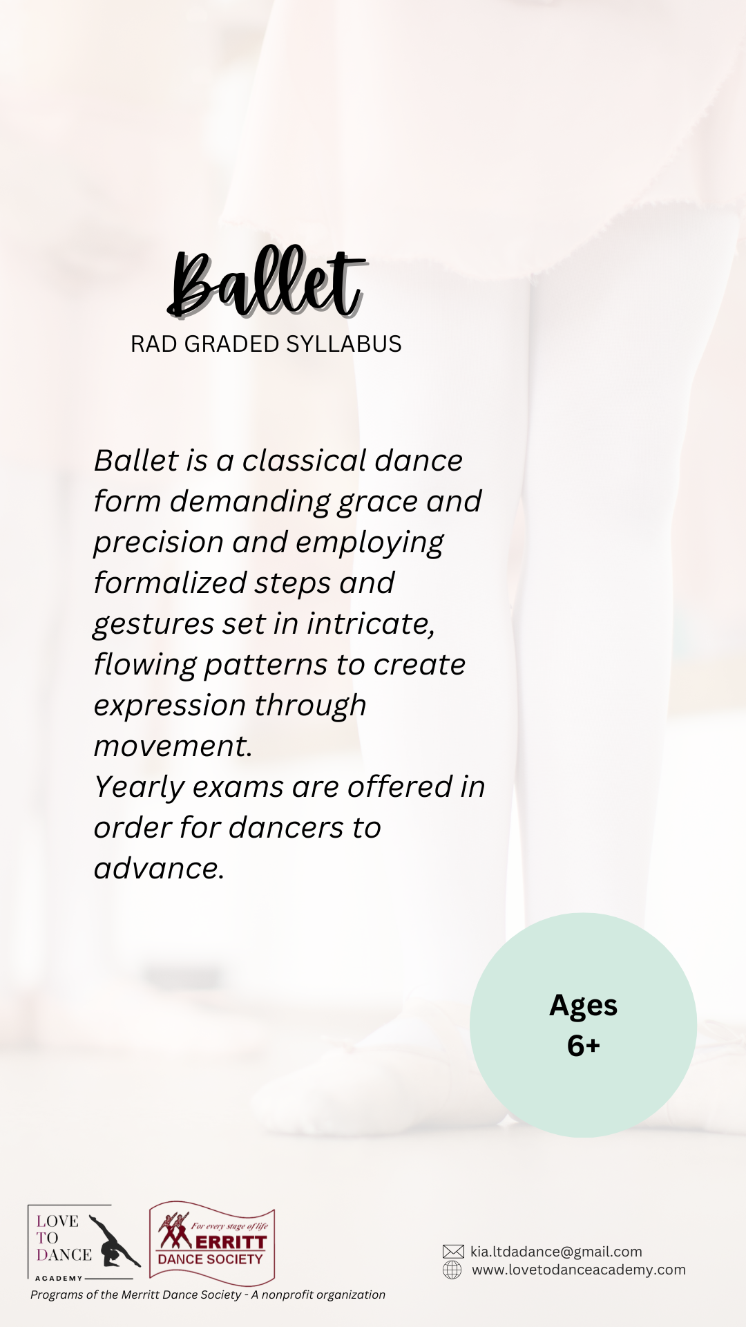 Ballet is a classical dance form demanding grace and precision and employing formalized steps and gestures set in intricate, flowing patterns to create expression through movement. Yearly exams are offered in order for dancers to advance.