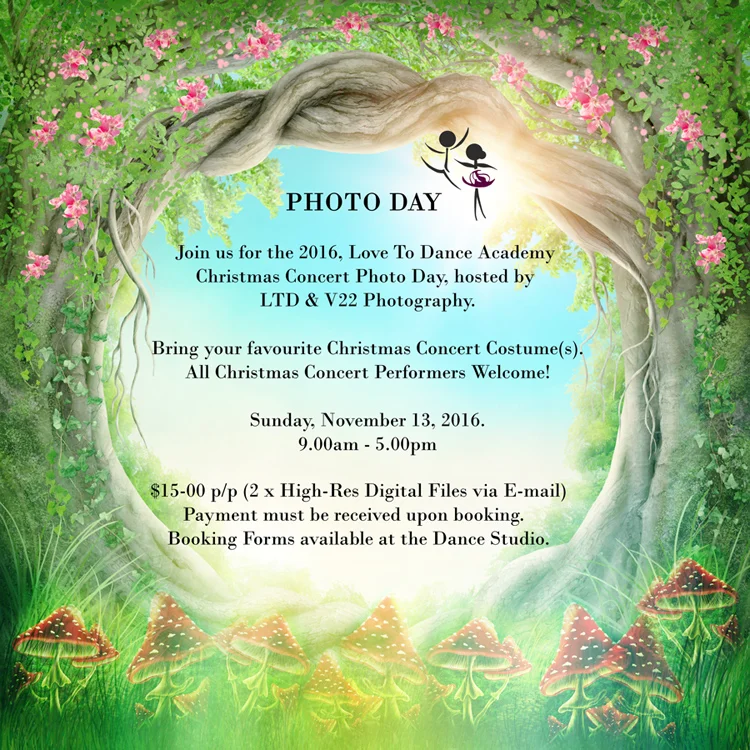 LTD Photo Day Sunday, November 13, 2016 9:00 a.m. 5:00 p.m. 09:00 17:00 Google Calendar ICS Christmas Concert ~ PHOTO DAYJoin us for the 2016, Love To Dance Academy, Christmas Concert Photo Day, hosted by LTD & V22 Photography.