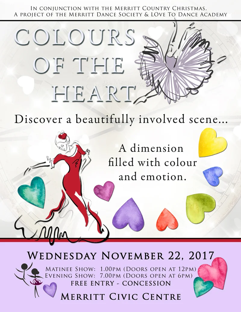 Colours of the Heart Wednesday, November 22, 2017 12:00 p.m. 10:00 p.m. 12:00 22:00 Merritt Civic Centre 1950 Mamette Avenue Merritt, BC, V1K 1R6 Canada (map) Google Calendar ICS The students of the Love To Dance Academy presents: